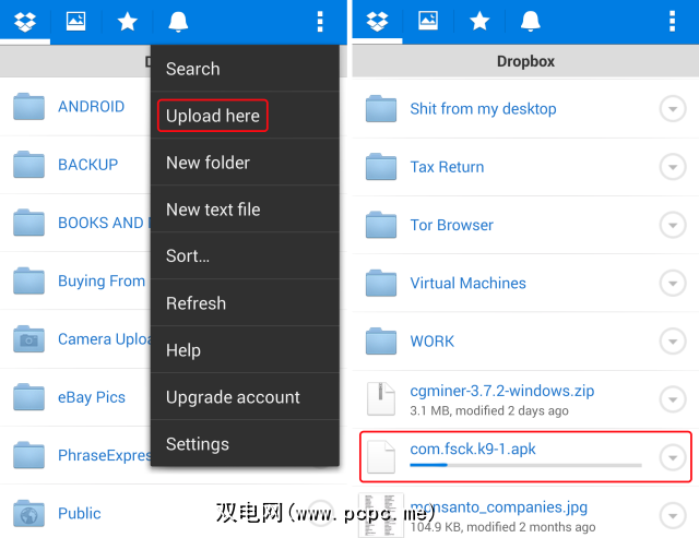 要在您的设备上手动安装应用程序(也称为侧载),建议您使用Dropbox。 Dropbox在许多设备上都提供支持(我什至没有看到与之不兼容的设备)。只需进入应用程序,选择“在此处上传",然后找到您提取的APK。然后它将上传到云中,您可以将其安装在装有Dropbox的任何设备上。