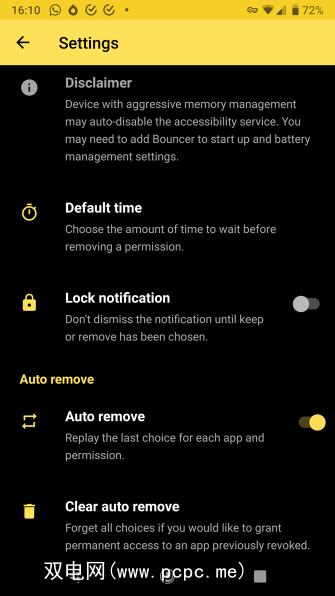 在Bouncer中点击 Settings 齿轮以调整一些选项。您可以选择默认情况下在应用程序拉出权限之前等待的时间,锁定通知以免丢失,并选择下次是否记住您的选择。