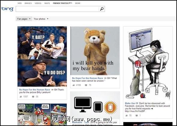 如果您将Facebook帐户连接到Bing(我建议这样做并将在以后进行扩展),您可以查看朋友和专页的照片。您也可以轻松查看自己的照片。就像只是图片的视觉新闻流!在下面,我只显示了我跟踪页面中的照片,同时请记住我朋友的隐私。