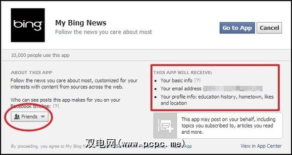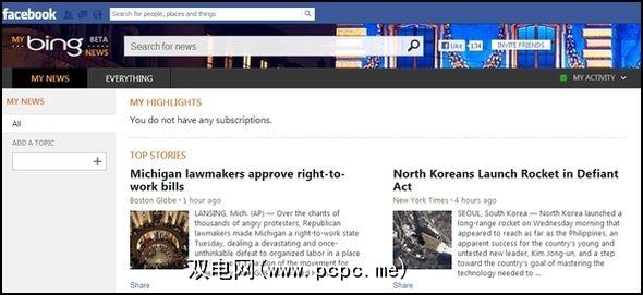 有Bing新闻…然后是 My Bing News,这是一个将Bing News与Facebook联系起来的Facebook应用程序。该应用程序可让您自定义要获取新闻的主题,还可以显示您最近阅读的内容(注意:如果您不希望好友看到应用程序发布到时间轴上的内容,请确保选择该内容