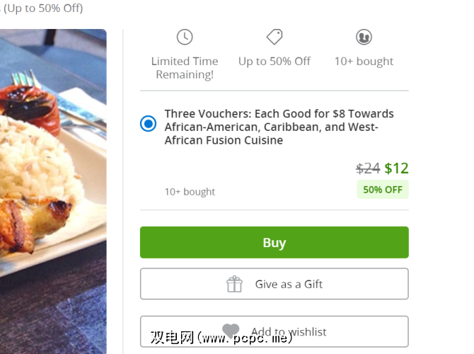 Groupon将显示受欢迎交易的购买者数量。当您转到交易页面时,在购买按钮上方会看到一小段文字,上面写着“购买了1,000多个"。显示的买家数量范围从10到25,000,甚至更多。
