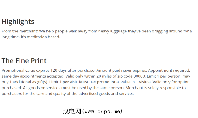 每个Groupon在页面底部都有一个“精美打印"部分,您应确保仔细阅读。 。即使公司合法,有时此部分也可以显示标题或说明遗漏的交易条件。不惜一切代价避免这些欺骗性交易!
