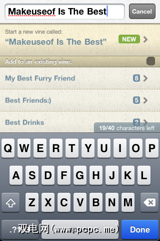 最后一步是创建自己的Vine。单击“ + Vine"符号,拍照,然后搜索所需的藤蔓名称即可。如果没有与您的搜索匹配的葡萄树,则在搜索框下方将显示一个标记为“ NEW"的按钮。单击该按钮,您将拥有一个闪亮的新Vine,它有望充满来自各地人们的照片!