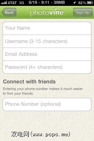 与Apple App Store中的任何应用程序一样,您首先必须进入iTunes并下载它。安装该应用后,您需要注册一个Photovine帐户。首先,您必须输入真实姓名,选择用户名,输入电子邮件地址,然后选择密码。