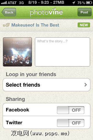 添加新图片时,应用程序可让您选择与Facebook和Twitter分享。在屏幕的最底部,有两个按钮,一个用于Facebook,一个用于Twitter。如果选择一个或两个,则将要求您输入用户名和密码,并准备与您的朋友和关注者分享您的图片。