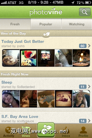 您可以通过单击屏幕底部标有“ Vines"的按钮开始。从那里,您将自动进入“新鲜"葡萄树页面。在屏幕顶部,您可以选择按“新鲜",“受欢迎"和“观看"进行浏览。如果您看到葡萄藤,则喜欢在旅途中旅行,可以将其添加到观察到的葡萄藤中。此外,您将照片上传到的所有Vine都会自动转到您的监视列表。屏幕的右上角还有一个搜索按钮。您可以输入任何您感兴趣的内容,然后查看是否有一个Vine供那些与您有共同兴趣的人使用。
