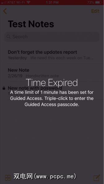 如果您在“引导访问选项"区域中设置了时间限制,则会话将在时间到时结束。您会看到一条通知,要求您三按按钮来输入密码。