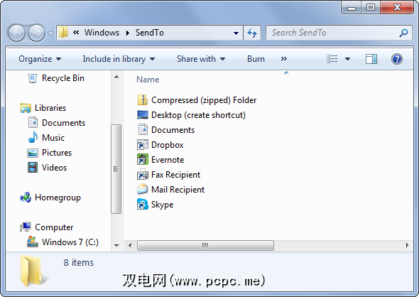 要在Windows 7或Windows 8中打开“发送到"文件夹,按Windows键+ R打开“运行"对话框,键入shell:sendto,然后按Enter。打开文件夹后,将要使用的快捷方式复制到该文件夹。如果要从“发送到"菜单中删除快捷方式,只需将其从文件夹中删除。