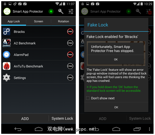 就像图库储物柜一样,在这里您也可以隐藏应用程序是密码的事实受保护的。通过点击已锁定应用旁边的“假"按钮,您可以使它看起来好像每次有人点击时都崩溃了。长按此对话框中的“确定"按钮,您将照常输入密码。