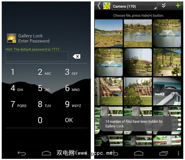 一旦隐藏了一些文件,它们将从您的常规库中消失,并且没有一个,但是无论滚动多长时间,您都可以看到它们。要访问隐藏的文件,只需启动Gallery Locker并输入密码(数字或图案)。然后您将能够查看您的图像,甚至可以在带有音乐的幻灯片中观看它们。