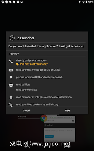 Z Launcher需要相当广泛的权限,包括呼叫电话号码,阅读短信和访问网络历史记录的权利。如果对此感到满意,请点击“下一步"。