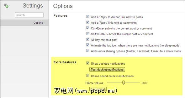 该扩展程序的“选项"显示了您可以启用的更多设置。如果您不厌其烦地关注不断更新的内容(或者期望获得重要更新),请启用桌面通知并在新通知上发出提示音。您也可以设置音量。