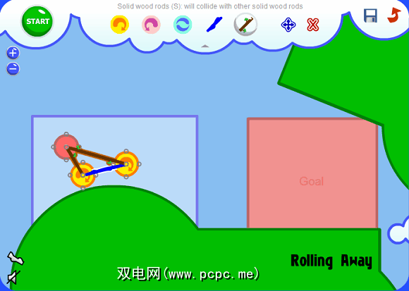 神奇陷阱的基本前提是将一个粉红色的滚轮从屏幕的一个区域移到另一个区域。它从浅蓝色区域开始,需要沉积在粉红色区域中才能通过关卡。只要您只使用可供使用的工具和零件,如何将它从一个位置转移到另一个位置就完全取决于您。