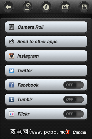完成照片的编辑和播放后,请单击屏幕右上角的磁盘图标以进行操作。保存。您可以将图像保存到相机胶卷,其他照片编辑应用程序,Instagram,Facebook,Twitter,Tumblr和Flickr。