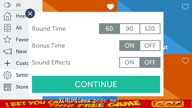 此处仅存在一些自定义项:更改舍入时间到60、90或120秒,切换奖励时间和切换音效。实际上,声音效果对于手持电话的人可能会派上用场,因为他们看不到屏幕,无法知道他们的手部扭动是否正常,但是如果您演奏,“通过"和“正确"的声音会变得令人讨厌。