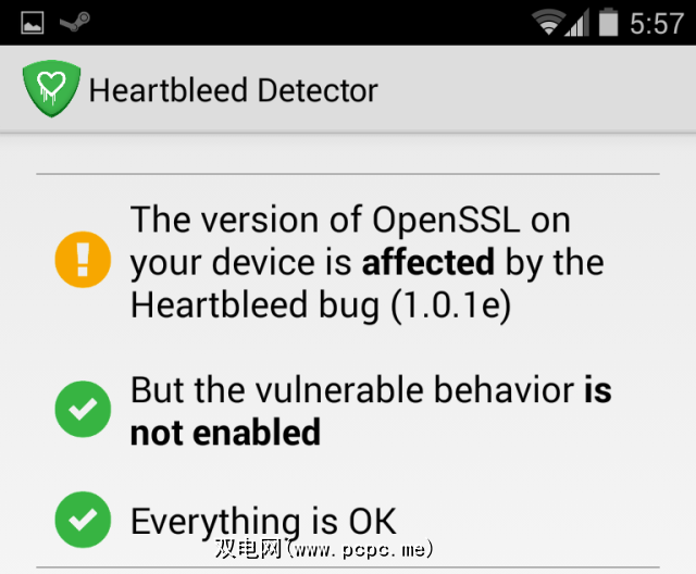 要仔细检查您是否确实脆弱,您可能需要安装Lookout的Heartbleed Security Scanner应用。这个应用程式不仅会检查您安装的Android版本。相反,它会检查您设备上的OpenSSL版本是否容易受到Heartbleed的攻击。它还会检查该设备是否确实容易受到攻击-如果OpenSSL是在不支持设备心跳的情况下构建的,那么您实际上可能是安全的。