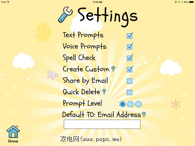 应用设置允许家长或教师启用和禁用应用中的功能,包括是否包括文字提示,语音提示,拼写检查,电子邮件共享或快速删除。