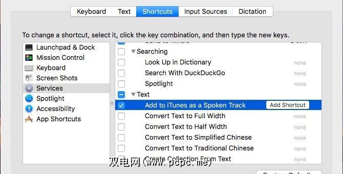 如果看不到添加口述曲目的菜单选项,请在服务下查看。仍然看不到该选项?确保已在系统偏好设置>键盘>快捷方式>服务>文本下启用了该功能。
