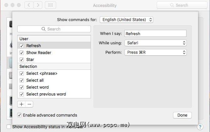 要查看可以使用的默认命令列表,请转到系统偏好设置>辅助功能>听写 >,然后点击听写命令... 按钮。单击命令列表下方的“加号"图标,开始设置自己的语音命令。