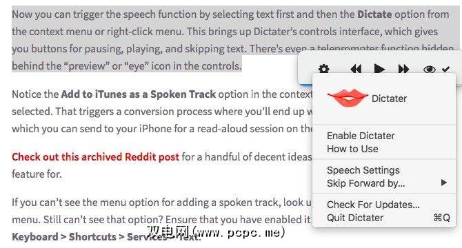 Mac语音功能的问题在于,您只能触发或停止它-您不能暂停朗读会话期间,可以快进或快退文本。第三方应用程序Dictater通过添加语音控件来允许您跳过文本并暂停阅读,从而为您解决了此问题。