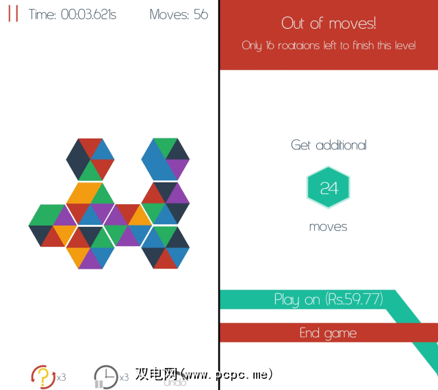 为了帮助您,Heroo有一些您可以使用加电功能,例如提示任何一个六边形的正确位置或冻结时间。此外,还有一个“撤消"按钮,以防万一您犯错了,这样您就被覆盖了。如果您未能通过某个关卡,您甚至可以购买更多的棋步,但是老实说,您无需这样做-您可以花一毛钱玩整个游戏。