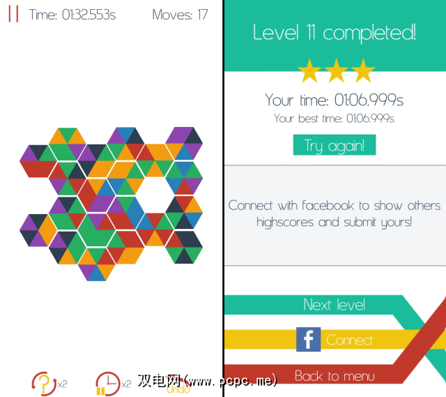 这很简单,看起来很棒,最初,您将旋转这些六边形是为了看到所有这些颜色旋转而带来的纯粹乐趣。 。但是,在任何时候,难度都会逐渐增加,而这正是让您着迷的游戏玩法。 Heroo对每个级别的旋转次数进行了限制,因此您必须在点击之前进行思考,并且还有一个计时器会倒计时您需要花费多长时间。