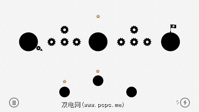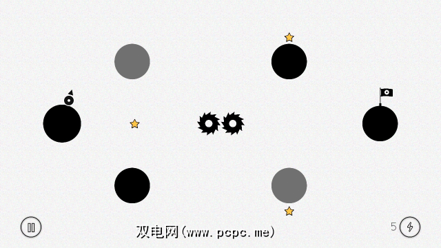 Roto在每个级别上都以空白屏幕开头,然后在屏幕上填充几个黑眼圈,每个黑眼圈都响起一声响亮的弹出声–这真是可爱,可爱的效果。在第一个圆圈上,您发现自己的Roto小人物顺时针移动。点击屏幕上的任意位置,它就会按照指向的方向跳动。
