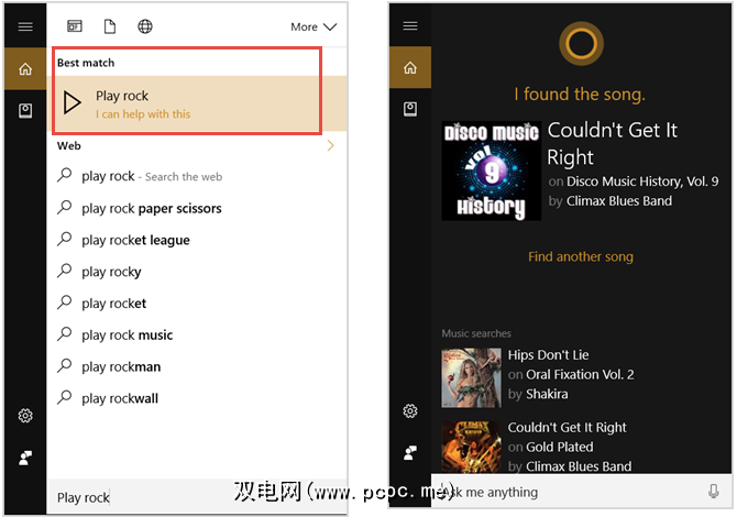 “播放音乐"。“播放[歌手]。" “播放[流派]。" “播放[专辑标题]。" 要识别歌曲,只需点击Cortana上的音符图标。既可以在计算机上播放歌曲,也可以在外部播放歌曲。![]()