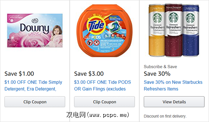 Amazon的优惠券部分中,您可以找到各种商品的折扣:健康,个人护理,食品以及饮料,电子产品,宠物用品,家庭用品等等。