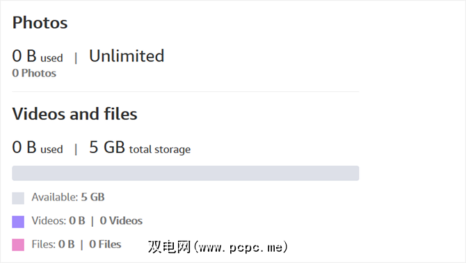 所有Amazon帐户在Amazon Drive上获得5 GB的免费云存储。这是类似于Dropbox,Google Drive和OneDrive的私有文件存储服务。如果您拥有Prime会员资格,您将获得无限制的照片空间和5 GB的文件和视频空间。