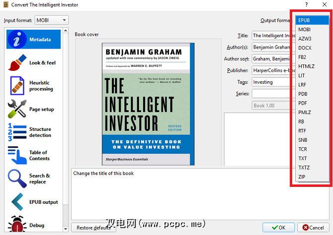 非常感谢Calibre提供。要将电子书转换为其他文件格式,请按照以下说明进行操作: