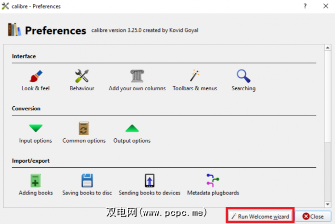 下一步,转到Calibre,然后将库移动到计算机上的共享Dropbox文件夹中。实现此目的最快的方法是转到首选项>运行设置向导,然后将Caliber应用程序指向Dropbox文件夹。