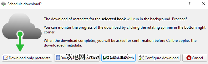 要扫描元数据,请在有问题的书上单击鼠标右键,然后转到编辑元数据>下载元数据和封面。屏幕上会弹出一个新框。您需要选择同时下载两者。