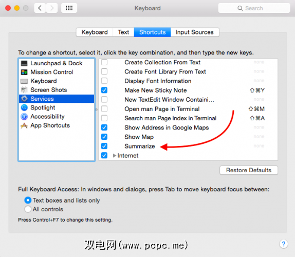 在Mac计算机上,默认情况下未启用该功能。要打开它,请转到系统首选项>键盘>快捷方式>服务。向下滚动到文本。如果未展开,请单击箭头以展开该部分,然后向下滚动至摘要并确保已选中该选项。