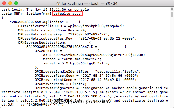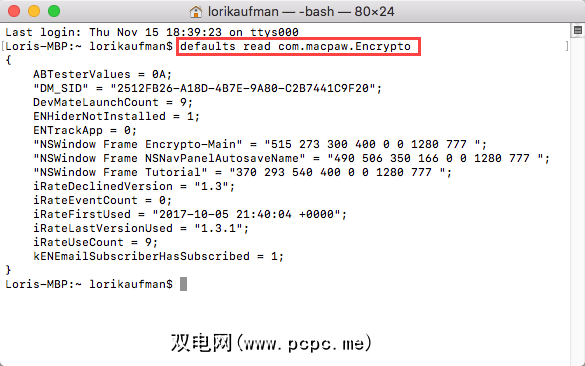 您可能并不在乎所有应用程序的用户首选项您的Mac。幸运的是,您还可以使用其域和PLIST文件查看单个应用程序的用户首选项。例如,要查看Encrypto应用程序的首选项,请键入以下命令。