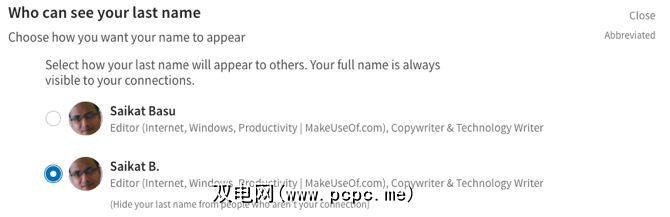 LinkedIn的安全设置之一允许您向与您无关的人(例如第二和第三名)隐藏您的姓氏-度关联),那么您应该利用这一优势来提高隐私权。