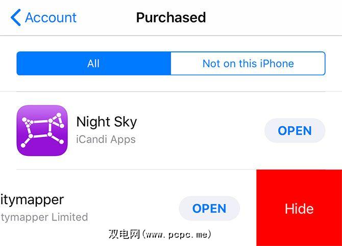 要隐藏购买,请启动 App Store ,然后点击右上角的用户图标。点击已购买,然后向下滚动直到找到您要隐藏的应用。向左滑动并点击隐藏。该应用程序将从您的购买历史记录中消失,您需要对Apple ID进行身份验证才能重新下载。