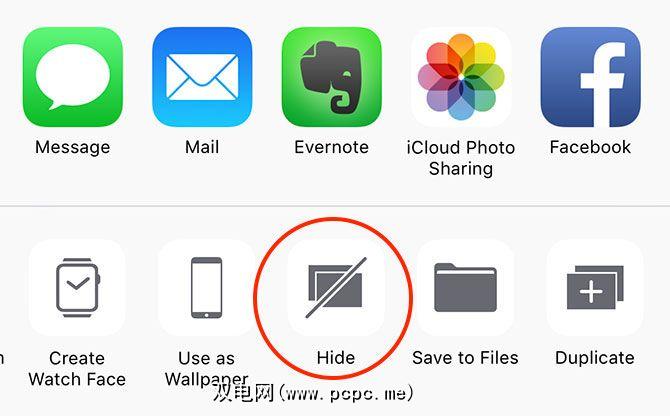 要将照片标记为隐藏,请首先在“相机胶卷"或“瞬间"中将其选中,然后点击共享按钮。在操作的底行上,点击隐藏,该照片将消失。如果要锁定照片,可以始终将其导出到新的Apple Note,然后按照上面的说明锁定注释。