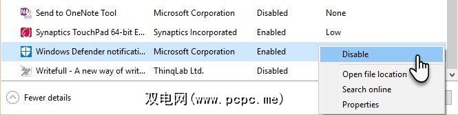 单击启动标签。向下滚动程序列表以找到 Windows Defender通知图标。您可以单击“名称"列并按字母顺序排列。右键单击条目,然后选择禁用。