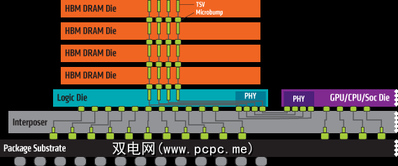该设计允许在每个芯片上堆叠额外的内存,从而减少了对更长连接,额外功耗,性能下降或发热问题的需求。实际上,HBM是如此高效,设计允许理论上堆叠四倍于当前RAM的芯片。当然,这不仅带来了更快,更高效的内存,还带来了显着的功率增益。