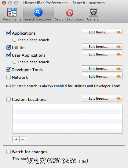 对于这些搜索位置中的每一个,您都可以编辑出一些项目以使列表更易于管理。您还可以对其中的大多数启用深度搜索,这将提示HimmelBar搜索超出其默认的两个文件夹级别。最后,如果您的应用程序目录比较繁杂,则可能需要在设置中启用“监视更改"。这将自动使HimmelBar的应用程序列表保持最新状态,而无需使用手动刷新按钮。