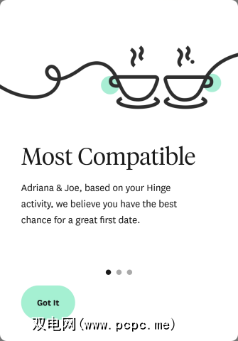 使用Hinge时,该应用会学习您的偏好。有时,它会为您提供被评为“最兼容"的用户。它基于起源于1960年代的Gale-Shapley算法,该算法将一组中的每个人和他们最喜欢的人配对在一起。