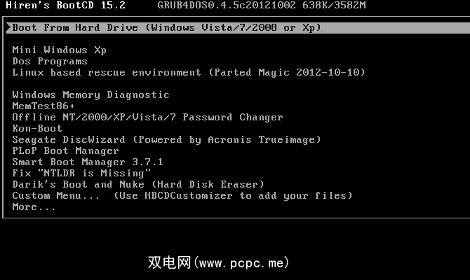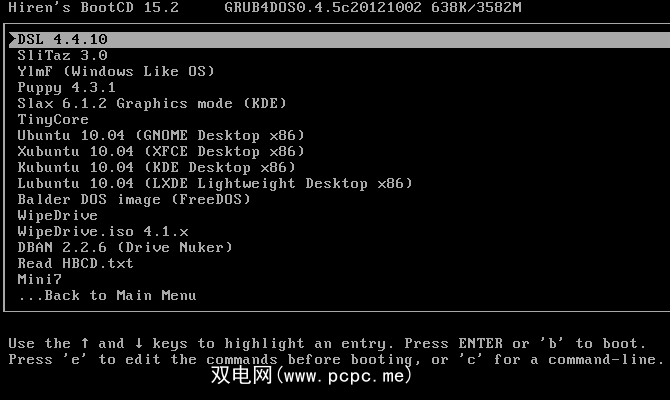 在此处查找CD或USB设备。很明显,哪一种是正确的选择-不要从硬盘驱动器或任何网络选项引导。使用箭头键选择设备,然后输入选择它。片刻之后,您会看到HBCD的主屏幕出现。