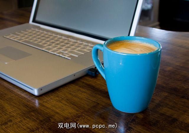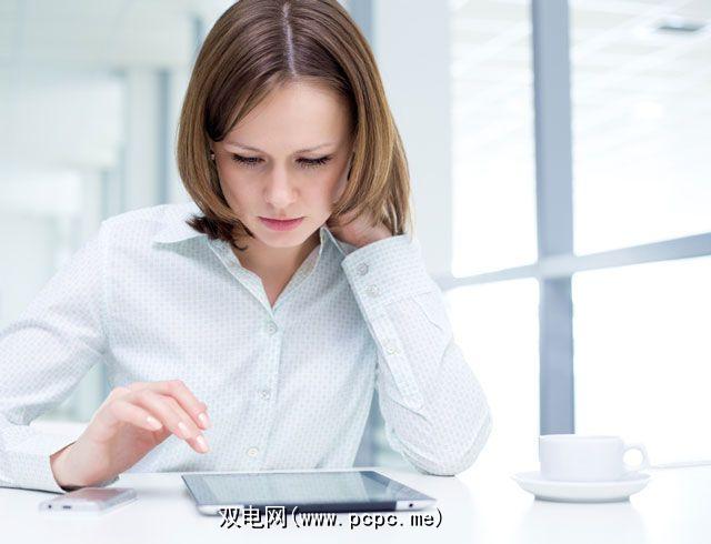 图片来源:使用数字平板电脑,咖啡和便携式计算机的年轻女子