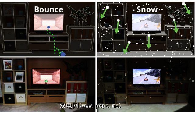 该团队已经能够产生诸如降雪的效果。在游戏中或在称为“弹跳"的模拟中对房间的方向做出反应的房间,研究人员制作了一个“手榴弹",该弹从电视机中滑出并在客厅附近弹跳。