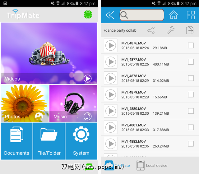 该设备没有板载存储,但是您可以连接到两个USB闪存驱动器。然后,任何连接到TripMate Elite的设备都可以使用Android应用程序,iOS应用程序[不再可用],Web界面或Mac或Windows应用程序访问那些闪存驱动器上的文件。不幸的是,访问该移动设备上的任何文件都需要该应用程序,因此,如果您希望与朋友共享文件,他们也将必须下载该应用程序。