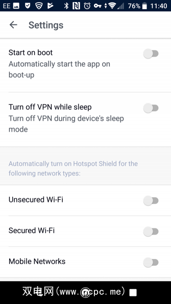 我们还查看了该应用程序的Android版本,该版本还具有恶意软件扫描程序。但是,尽管“设置"屏幕确实具有在手机处于睡眠模式时禁用VPN的选项,但与桌面应用程序的区别很小。您还可以选择为移动和Wi-Fi网络自动启用Hotspot Shield。
