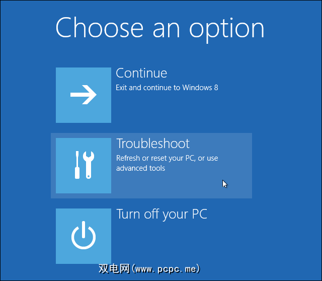出现“选择选项"屏幕时,单击或点击“疑难解答"图块。