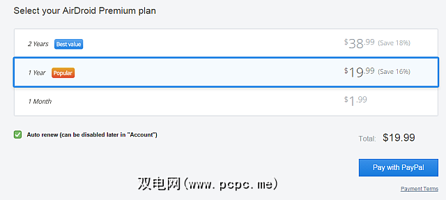 付款是AirDroid的一大问题。这些费用实际上是合理的,每年20美元或每月2美元。但是您只能使用PayPal付款。没有Google Play商店,没有Google电子钱包。这是用于Android的应用程序,可与Google帐户一起使用。因此,您最好了解如何设置PayPal帐户。