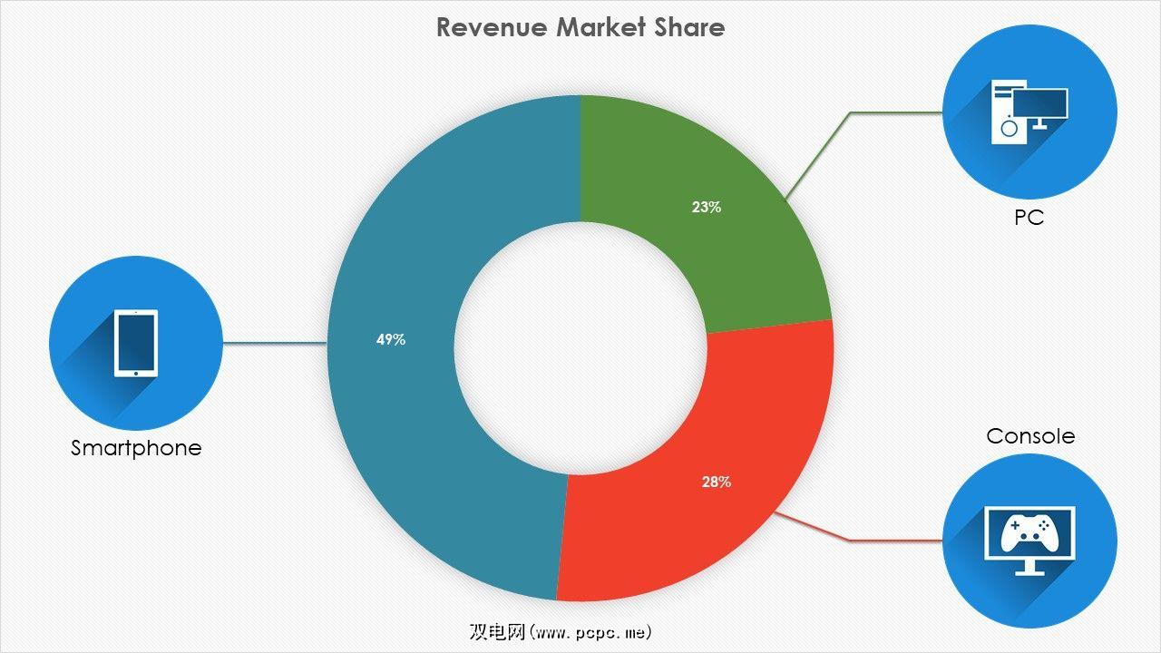 根据分析公司Newzoo 的数据,智能手机游戏在 2020 年超过了 PC 和游戏机平台。手机游戏的收入达到了惊人的 772 亿美元,远高于 PC 的 369 亿美元和游戏机的 452 亿美元。这意味着智能手机和平板电脑现在几乎占据了市场的一半。